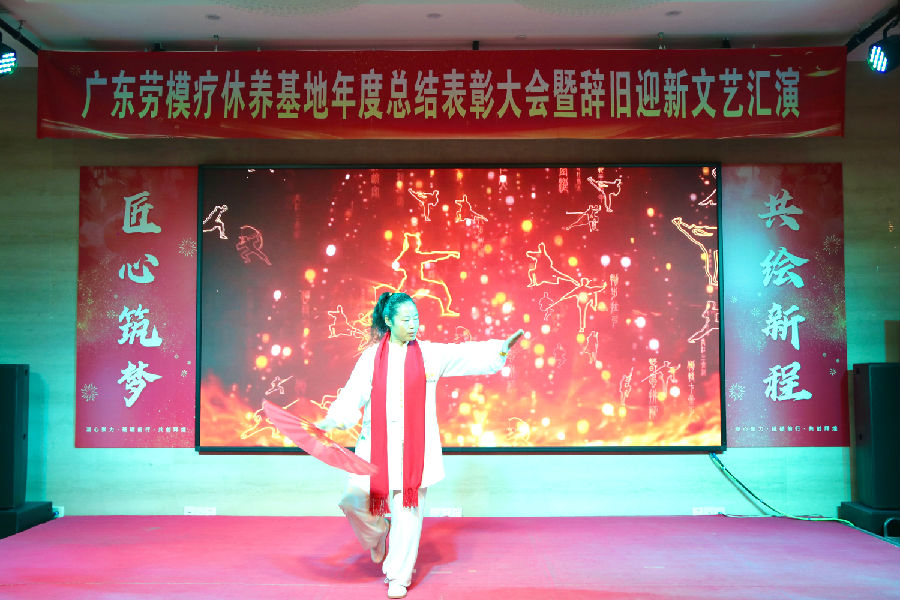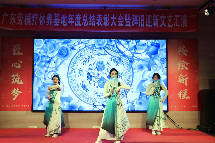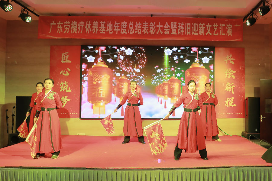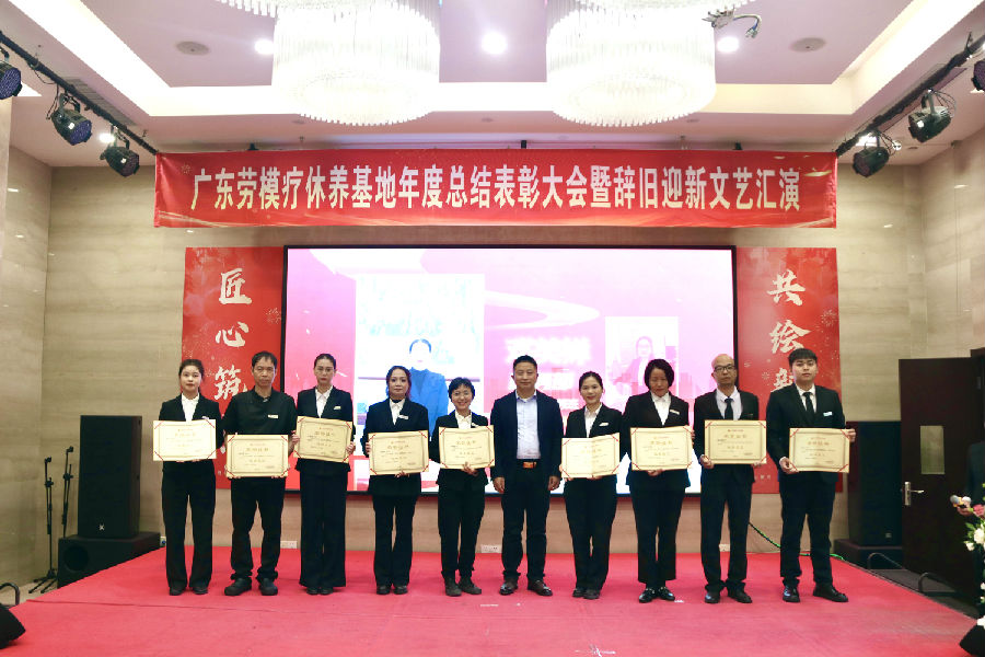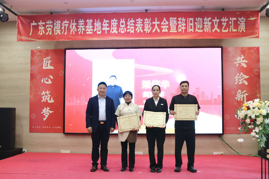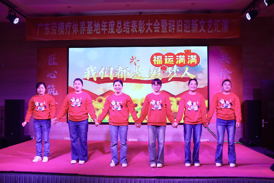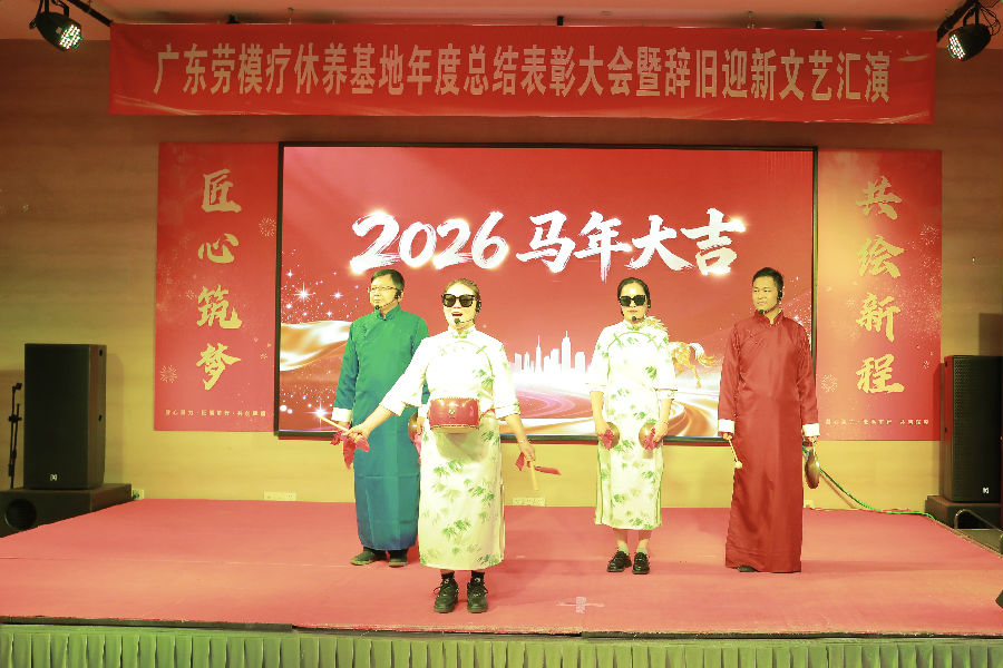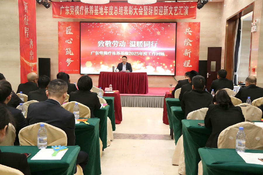 岁月更迭,华章日新。2026年1月30日下午,广东劳模疗休养基地“匠心筑梦·共绘新程”2025年度总结表彰大会暨2026年辞旧迎新文艺汇演在基地多功能厅举行。活动秉承简朴务实的风格,基地全体职工70余人齐聚一堂,共同回顾奋斗历程,表彰年度先进,展望崭新征程,并以自编自演的文艺节目共迎新春。