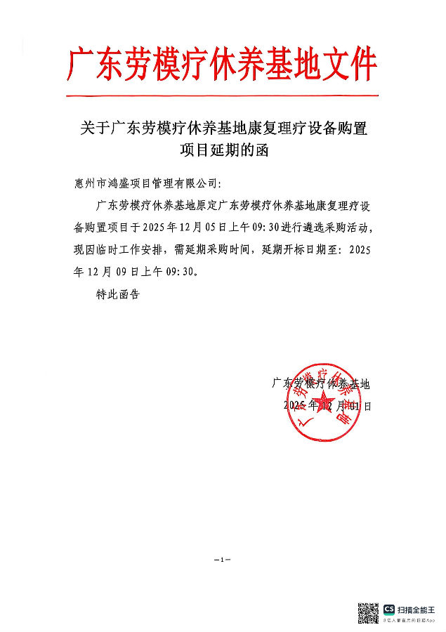 关于广东劳模疗休养基地康复理疗设备购置项目延期的函