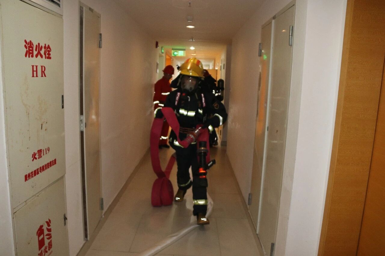 在模拟火情扩大的紧要关头,劳模基地指挥中心向平海消防救援站发出请求支援信号,通过对方专业力量及时介入与我方紧密协同,现场演示了高层火情扑救的战术要领与专业装备应用,为全体人员上了一堂宝贵的实战教学课。