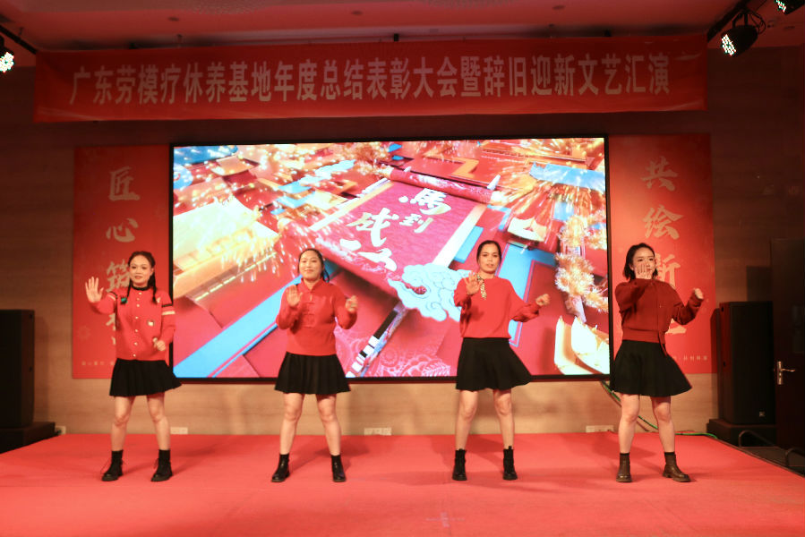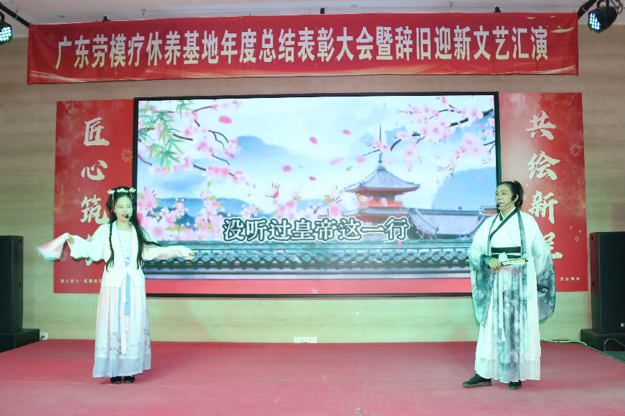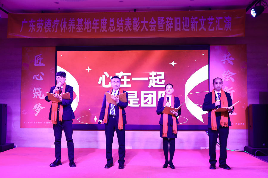 岁月更迭,华章日新。2026年1月30日下午,广东劳模疗休养基地“匠心筑梦·共绘新程”2025年度总结表彰大会暨2026年辞旧迎新文艺汇演在基地多功能厅举行。活动秉承简朴务实的风格,基地全体职工70余人齐聚一堂,共同回顾奋斗历程,表彰年度先进,展望崭新征程,并以自编自演的文艺节目共迎新春。